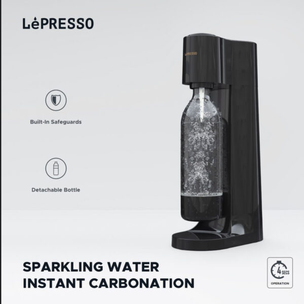دستگاه نوشیدنی گاز دار ساز لپرسو مدل LePresso Sparkling Water Instant Carbonation Machine LPSWMKBK کربناسیون فوری آب درخشان LePresso یک وسیله بی سیم است که می تواند نوشابه گازدار 850 میلی لیتر را از آب ، آب میوه یا هر نوشیدنی غیر کربنی دیگر تولید کند. طراحی هوشمند و عملکرد آسان ، نوشابه 850 میلی لیتر را فقط در 4 ثانیه در اختیار شما قرار می دهد و به دلیل بوتل قابل جدا شدن ، ظرف به راحتی قابل حمل است. عملکرد سیستم کاملاً اتوماتیک است ، بنابراین شما فقط باید کپسول CO2 را از پایین وصل کنید ، پس از آن ، با درج بطری و لکه دار کردن آن ، عملیات شروع می شود و در هیچ زمان ، می توانید از نوشیدنی گازدار خود لذت ببرید. این اسباب بازی قابل حمل برای اجتماعات بسیار مفید است زیرا به همان اندازه نوشیدنی درخشان که فقط در یک ضربه محکم و ناگهانی انگشت مورد نیاز به شما خدمت می کند ، کمک می کند.