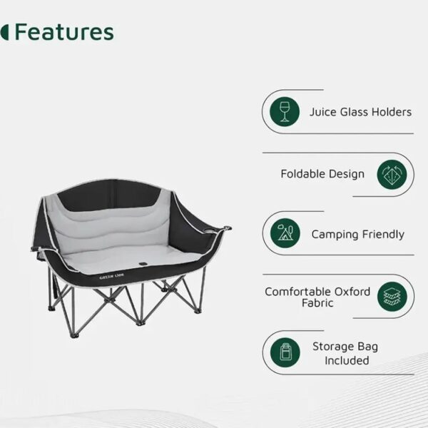 یکی از ویژگیهای کاربردی این صندلی، وجود نگهدارنده لیوان برای هر نفر است. این ویژگی در کمپ یا هنگام استراحت، راحتی بیشتری فراهم میکند. طراحی تاشو و ابعاد مناسب در حالت جمعشده (۲۵ × ۲۰ × ۹۰ سانتیمتر) امکان حمل آسان و قرارگیری در کیف همراه را فراهم کرده است. در حالت باز نیز با ابعاد ۱۴۰ × ۵۰ × ۹۰ سانتیمتر فضای کافی برای دو نفر و ثبات قابلقبول ارائه میدهد.