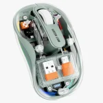 برای جذاب تر شدن موس یک نوار RGB دور موس قرار گرفته. درب موس برای دسترسی به دو دانگل USB به راحتی باز میشه. در کنار دانگل قرار گرفته، امکان اتصال با بلوتوث نسخه 5.1 به دستگاه های مختلف رو با این موس دارید. با توجه به پورت تایپ سی قرار گرفته امکان اتصال همزمان به سه دستگاه رو دارید. باتری 400 میلی آمپر ساعتی به وسیله این پورت تایپ سی شارژ میشه. دقت این موس 2400 DPI هست که امکان تنظیم از 800 تا 2400 DPI رو با این موس خواهید داشت.